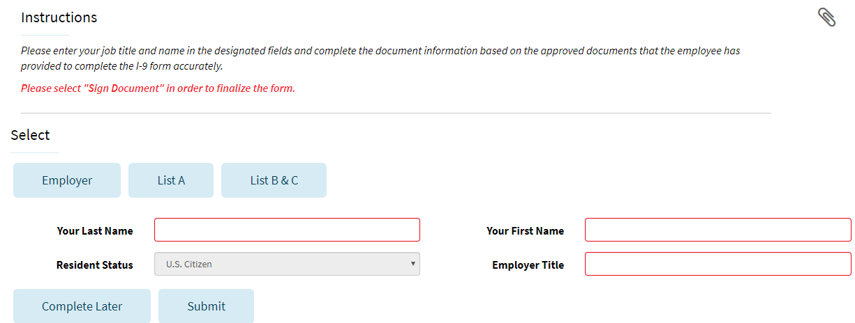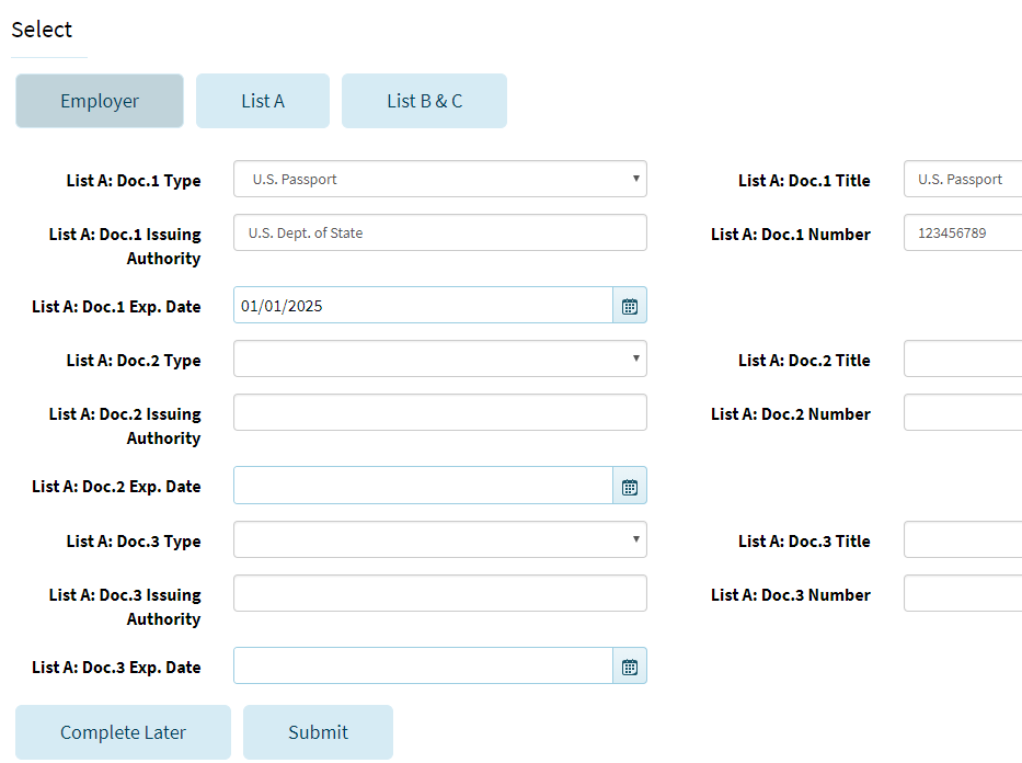 - Indicate your information and select whether the supporting documentation is from List A or List B & C. For reference, a list of acceptable documents is included on the last page of this document.